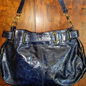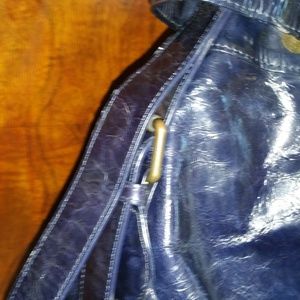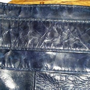 The leather is super cool - with a bubbled look to it. The detachable, non-adjustable strap has a drop of seventeen inches and the top closure is magnetic. Inside you'll find crumply cream fabric lining with zip and slide pockets, plus, while buckle details decorate the sides and brass hardware is