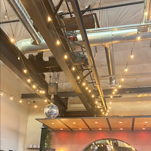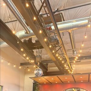 Stylish industrial ceiling featuring exposed pipes and string lights. Perfect for modern decor enthusiasts.