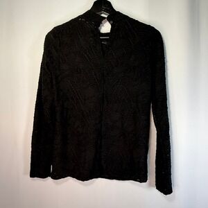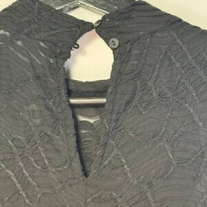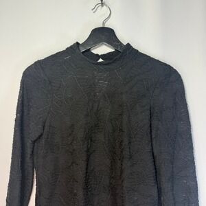Keywords:lace top, black lace, mock neck, long sleeve, elegant, sheer, party, evening, designer top, xs top, extra small top, button closure, textured