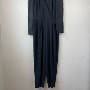 Stylish dress jumpsuit by MS Chaus featuring sheer sleeves. It measures 17 inches armpit to armpit laying flat, 14 inches at the waist, and has a 28 inch inseam.