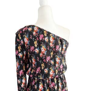 It comes with one shoulder sleeve with slightly ruffled cuff, elasticated waist, slightly loose from the bodice and overclocked edges, constructs this mesmerizing, mid-length crumpled skirt with a ruffled hem