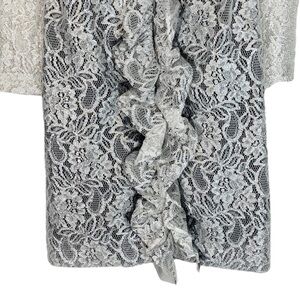 Features: Sheer long sleeves. White with silver metallic lace detailing. Round neckline. Ruffle back detailing the full length of the back. Above the knee fit. Hidden zipper closure