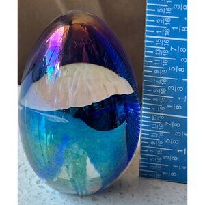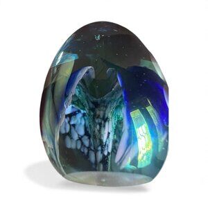 This handcrafted blown glass paperweight features a mesmerizing interior flower design with iridescent exterior hues.
