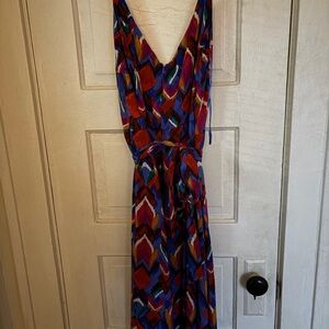 MSI dress with a vibrant abstract pattern. Features a mix of blue, red, and brown tones.
