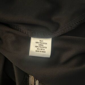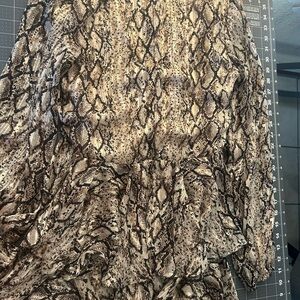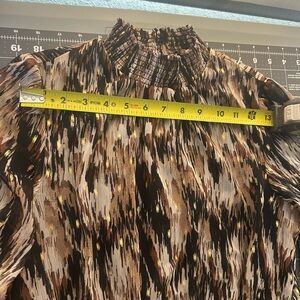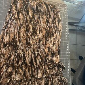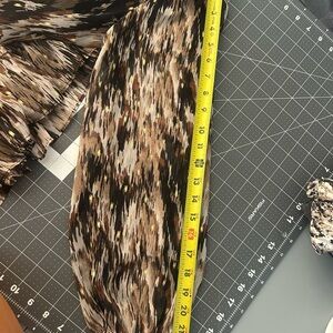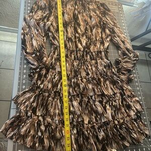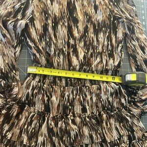 Elegant dress with abstract pattern. Features ruffle accents. Perfect for any occasion.