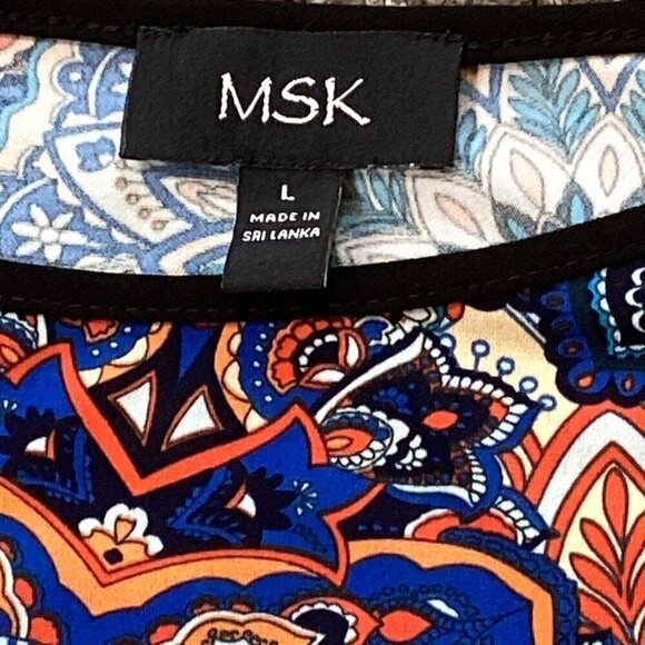 MSK BOHO Slinky Bell Sleeve Shift Dress Colorful Mandala Pattern Sz L #313G