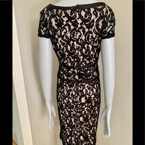 Size 10. The perfect Little Black Dress! Like new condition - clean, steamed & ready & wear! Comfortable and flattering lace dress with some stretch. Cap sleeves. Nude/peachy pink lining that peeks through the lace overlay. 80% Cotton 20% Nylon. Shown modeled on a size 0 mannequin with extra fabric cinched in back – fit may differ. Approximate measurements (taken when laying flat - cannot guarantee fit):
