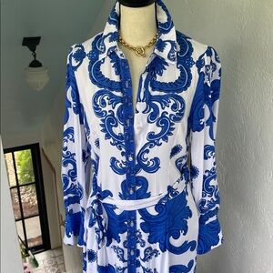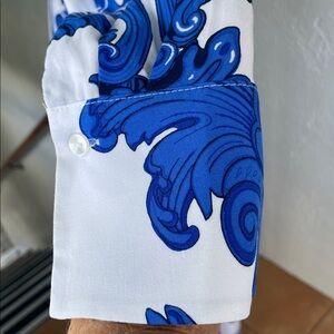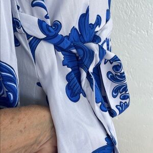 MSK Blue and White Acanthus Dress has a chiffon/silky feel. This dress is STUNNING on!!! It is a very generous small and great for TALLS! Also sleeves are long with beautiful one button Detailing and you can turn the sleeve over to have a cough look or there’s also a button in the sleeve that you can roll up above your elbow. This dress is dramatic. It makes an entrance and is perfect for your vacation, wedding or whatever occasion that you need to look gorgeous this dress will do it. I love that the button down style of this dress allows you to wear something underneath like a camisole or a tube top or you can layer this dress with a slip dress underneath there are so many options . The length of the dress is 54 inches and the pit to pit measurement is 18 1/2 inches. The waist measurement is 16 “. Size small Questions? Leave a comment below!
