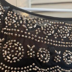 The dress features a delicate beaded and mesh neckline and illusion cap sleeves. High waisted with built-in bra offers an option to go without.