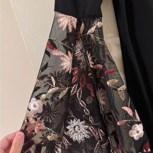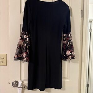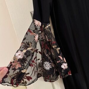 Chic black dress with floral-patterned long sleeves. Ideal for stylish outings.