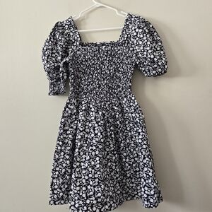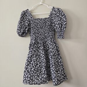 MSK Floral Puff Sleeve Smocked Bodice Dress Navy Blue Size Medium