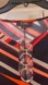 • Design: Bold geometric print in shades of red, orange, black, and beige
