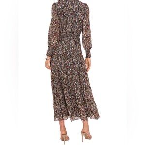 Make a statement with this stunning MSK dress featuring a bold geometric print accented with foil details. This pullover style boasts a chic split neckline and adjustable tie strings at the neck for added flair. Fully lined for comfort, it creates a beautifully flattering silhouette. Measuring approximately 55 inches in length, this dress is both stylish and practical—it’s machine washable!