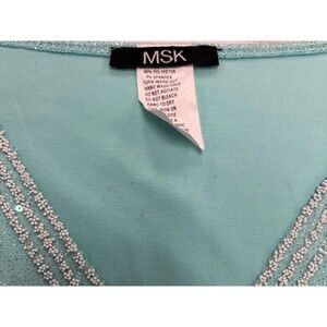 FLAW: There is a slight stain on the inside of the shirt as seen on the 2nd to last picture. Not noticeable. There is also a rip at the bottom as seen on the last picture. It is seen through the inside of the shirt. It is not noticeable on the outside. The MSK Y2K Turquoise Blue beaded sequin tank top is a stylish and vibrant piece perfect for various occasions. With a classic fit and a flattering V-neckline, this sleeveless top features a solid pattern accented with beaded and sequin details. The turquoise blue color and fairy character theme make it ideal for weddings, parties, or casual outings during the summer, fall, or spring seasons. Made from a lightweight polyester and spandex blend, hand wash only to maintain its vintage charm. Add a touch of flashy fun to your wardrobe with this colorful club-inspired top from MSK.