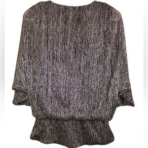 Tags: MSK, metallic blouse, shimmer top, bronze blouse, rhinestone trim, dolman sleeve, V-neck top, holiday blouse, evening wear, sparkle shirt, dressy blouse, bronze shimmer, glam top, party outfit, New Year’s Eve, night-out style, elegant blouse, cocktail top, metallic brown, stretchy top, lightweight blouse, women’s small, holiday party, chic glam, statement sleeve