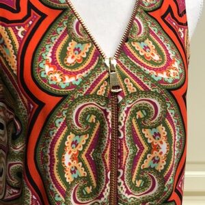 Turn on your brights, powered by paisley in this V-neck dress from MSK. I am obsessed with this color combination. Think gold sandals, bangles and hoop earrings to accessorize this sexy dress. Designer inspired Paisley Fabric packs and travels well. Gold metal zipper detail down the front of the dress pulls the look together. Approximate measurements in photos. Excellent condition. No known flaws. Red, white black green, yellow, pink, blue, gold zipper