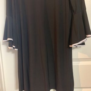 Black dress with bell sleeves; white piping around sleeves and neck; Hits above knee; unlined, thin but not see-through; some stretch; never worn