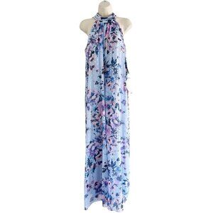 MSK Petites floral wide leg chiffon jumpsuit. Jumpsuit is done in light blue with a pink, purple and gold floral print. It's sleeveless and has a halter neck that ties in the back. Jumpsuit is made of 100% polyester and is a woman's size petite large. Jumpsuit is brand new with tags.