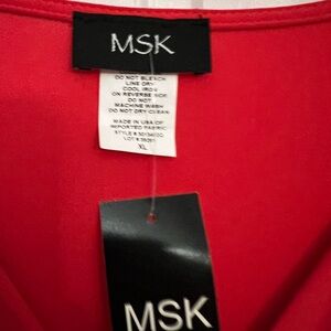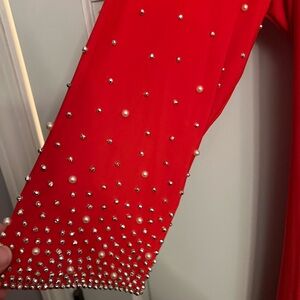 This NWT elegant red dress by MSK is designed for wedding guests and cocktail events, featuring a flattering v-neckline and long sleeves adorned with sparkling embellishments. The full-length silhouette offers a sophisticated look, perfect for making a statement at any formal occasion.
