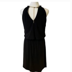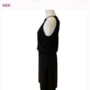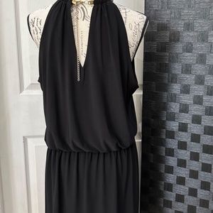 MSK solid black necklace dress, stretch gold neck band, chain, elastic waist for blouse effect, halter style neck line, 95% polyester, 5 % spandex, armpit to armpit 22.5” Gently used, very good condition. Size XL