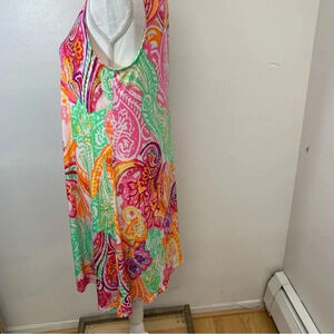 MSK Tropical Dress Small Pink Print A Line Above Knee Stretch Knit Key Hole