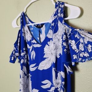 Super cute blue and white tropical floral print dress. This is a women sized medium petite with a cold shoulder sleeve and good condition. E7