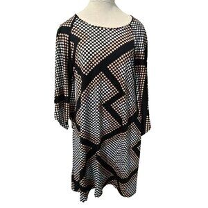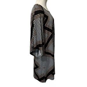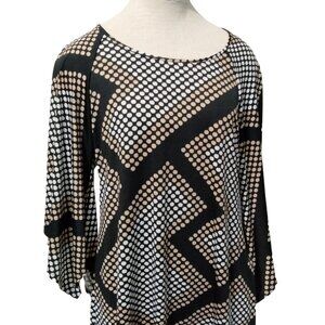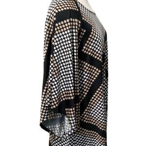tunic dress, geometric print, polka dot pattern, flowy sleeves, relaxed fit tunic, MSK dress, lightweight tunic, casual tunic, semi-formal dress, size large dress, modern print dress, versatile tunic, black and beige tunic