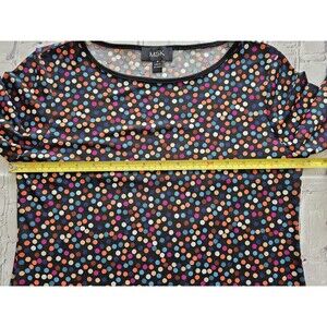 This is a pre-owned MSK womens sheath dress in size Small. Features a classic black background with a vibrant multicolor polka dot pattern. Made of 96% polyester and 4% spandex for a comfortable stretch fit. Short sleeves, scoop neckline, and pull-on style make it perfect for casual or semi-formal occasions.