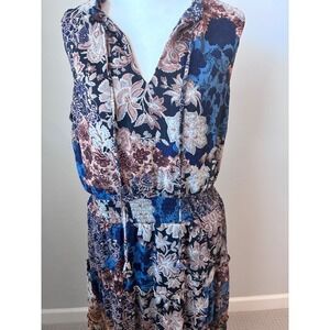 Embrace effortless elegance with this stunning MSK maxi dress. A captivating floral print in a rich palette dances across the lightweight fabric, creating a mesmerizing visual texture. The sleeveless design and flattering V-neckline offer a breezy, comfortable fit, while the smocked waist gently cinches your silhouette for a touch of definition. Delicate ties at the neckline add a whimsical detail, enhancing the dress's overall charm. Perfect for a garden party, a summer wedding, or a romantic evening stroll, this dress will make you feel confident and radiant.
