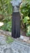 Fun pants with elastic waistband that was stretch easily to 28 inches. This is a polyester fabric. The wide leg pants have been trimmed in a scallop up the side with three rows of rhinestones. New with tags.