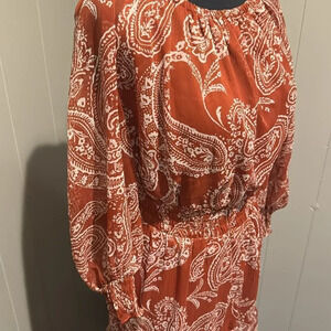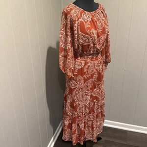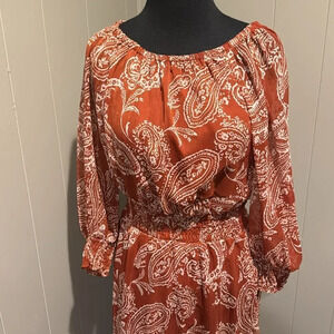 MSK terra cotta paisley print sheer crepe lined body/semi-sheer sleeves shirred waist ruffle hem midi. Shirred ruffled cuffs. Raglan shoulder seam. Elastic neckline. Pullover. 100% polyester. Small. Armpit to armpit approximately 20 1/2 inches. Shoulder to hem approximately 46 inches. Excellent condition. Nonsmoking home.
