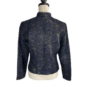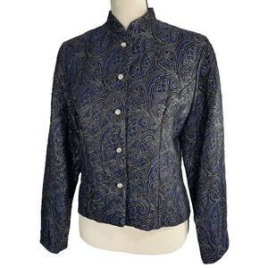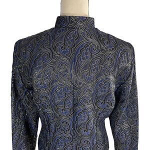 MSK Button Up Blazer Jacket. Mock neckline. Silver rhinestone buttons down the front. Pleated for a fitted look. Navy blue with black and metallic silver paisley print throughout. Eye-catching, unique formal wear piece, evening wear, or for a special occasion.