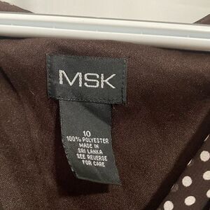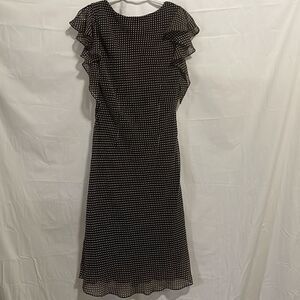 MSK Sleeveless polkadot dress with ruffles on the chest and small ruffles on the shoulders. It is a brown dress with white polkadots