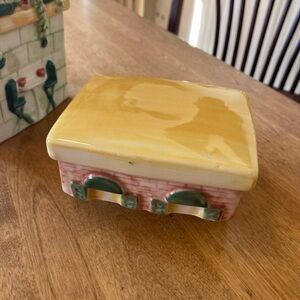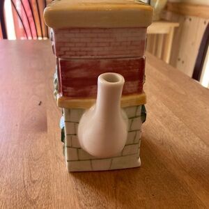 MSRF ceramic "Storefront Cafe" teapot. It is 6 1/2" high and 7" from spout to the handle. There are no chips or cracks. Very cute