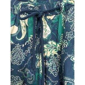 Labeled an XS but designed with an oversized, relaxed fit, these lightweight cotton balloon pants feature a vibrant paisley floral print in lagoon green. The drawstring waistband adds flexibility for a comfy, boho-chic look.