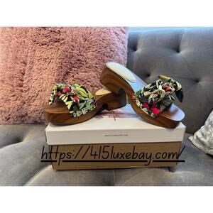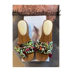 Elevate your look with these gorgeous Jessica Simpson Resima wooden-heel sandal slides. Featuring a floral fabric bow with a chic gold embellishment, these sandals combine playful charm with timeless sophistication. New in box and ready to ship fast!