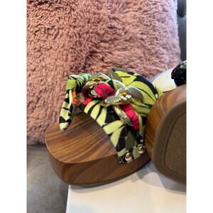 • Material: Wood platform sole, floral fabric upper with bow & gold detail