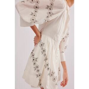 Effortlessly chic and romantic, this 100% cotton Free People mini dress features a flattering fit-and-flare A-line silhouette with full covered button closures down the front. Designed with airy puff 3/4 sleeves, floral embroidery, and soft pleating throughout. Fully lined for comfort and structure.