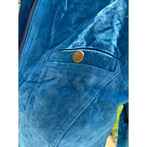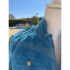 Beautifully soft suede in a striking aqua/teal tone, this luxe leather shacket is new without tags and an instant wardrobe standout. Designed with a front zipper, two pockets, and zip details on the cuffs, it blends utility with chic sophistication. A rare find, perfect for layering or elevating casual looks.