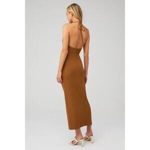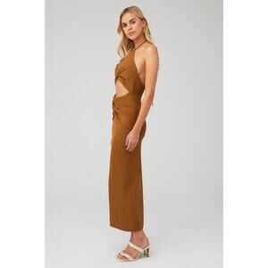 Chic and sophisticated, the Hallie Midi Dress by Significant Other features a halter neckline with back tie, a flattering front twist with cutout detail, and a stunning open back. Crafted from stretchy, fully lined fabric for a comfortable and sleek fit. 14.5" waist and 16" chest measurement with lots of stretch. Small mended flaw inside the lining from shipping—completely invisible when worn.