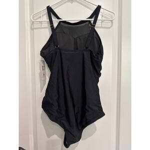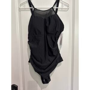 New with tags. Sleek one-piece featuring side ruching for a flattering fit, a sheer mesh inset at the neckline, adjustable straps, and a high back for confident coverage. Privacy/sanitary liner intact.