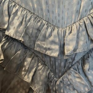 Crafted from a luxurious Silk Viscose Jacquard with subtle dot detailing, the Tiffin Dress is designed as the ultimate party look. The dress features voluminous elbow length sleeves with ruffle detailing that extends across the front chest panel. The body hugging dress has an elasticated middle hemline that creates a unique pleating effect.