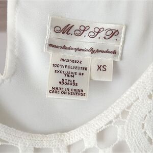 This is an elegant, off-white blouse featuring a delicate and feminine design. The garment showcases a prominent crochet lace panel down the center front, adorned with floral motifs and a lattice pattern that adds textural contrast and a vintage-inspired touch. The silhouette includes softly gathered short sleeves and a peplum-style hem, which creates a subtle flounce and enhances the waistline for a flattering fit. The fabric appears to be a lightweight, drapey material, possibly a chiffon or georgette, contributing to the blouse’s airy and refined aesthetic. Decorative seaming details along the waist and shoulder enhance its structured yet romantic appeal, making it suitable for both casual chic and semi-formal styling.