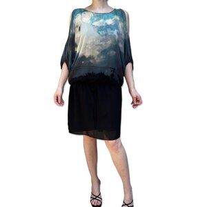 Cloud Dress, Printed Dress, Artistic Dress, Statement Dress, Chiffon Overlay, Batwing Sleeve Dress, Adjustable Waist, Black Skirt Dress, Medium Size Dress, Unique Print Dress, Elegant Cocktail Dress, Semi-Formal Dress, Avant Garde