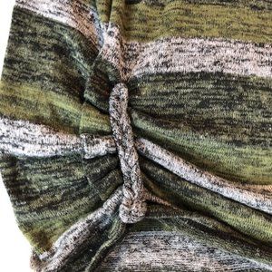 MSSP light weight sweater with stripes (green, gray, dark green); 35% polyester, 10% rayon, 4% spandex. Cowl neck, right bottom front is drawn up to accentuate the hip. Non-smoking home.