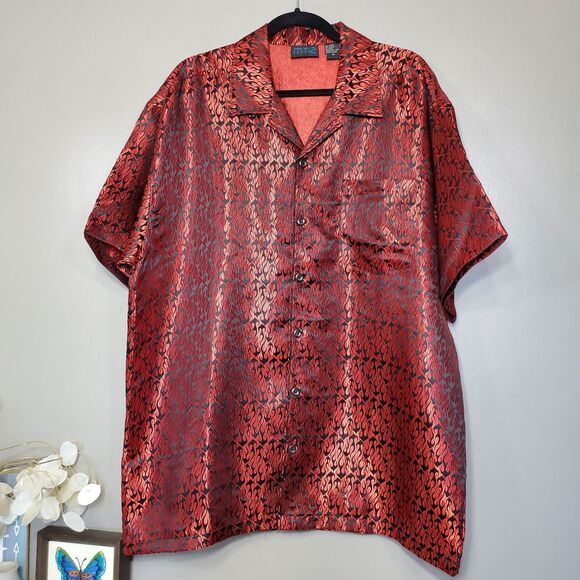 MT:2 Hot Topic Shirt Mens Size XL Metallic Red Black Flames Button Short Sleeve