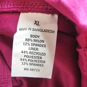 The shorts are high waisted with 2 front pockets, elastic waistband with a drawstring in a beautiful fushia color, and has attached spandex shorts underneath. Made with recycled polyster. Excellent condition. NEW.