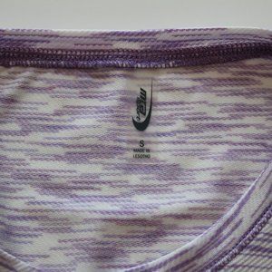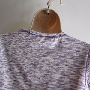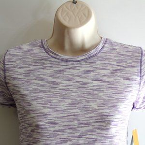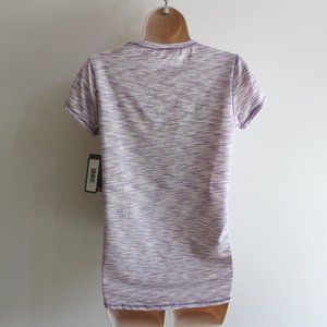 This casual athletic t-shirt top is purple and white with purple stitching. It has short sleeves with a rounded neckline. It is lightweight and fast dry with wicking. It is new with tags.