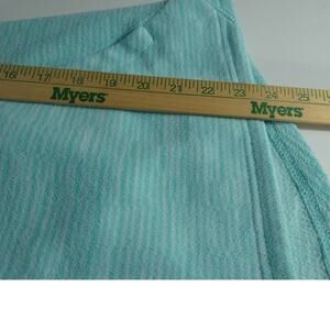 Mint green with white stripes, soft fleece material, side pockets, and a zippered front closure.