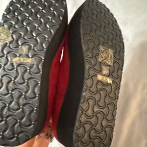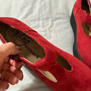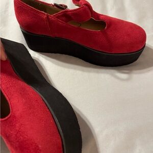 Chic red suede footbed Mary Jane platforms. Buckle strap for secure fit.